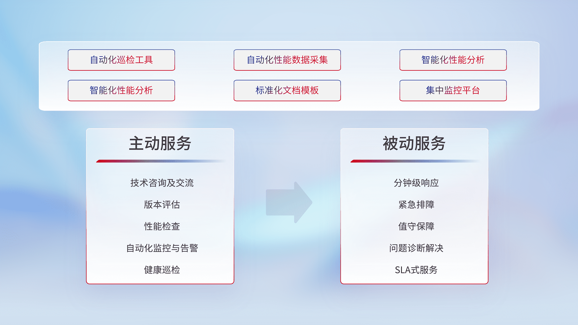 智能化工具和标准化文档,,保障服务质量,,,提供主动服务(包含技术咨询、、、、版本评估、、、、性能检查、、、、自动化监控与告警、、健康巡检)和被动服务包含(分钟级响应、、、、紧急排障、、、、值守保障、、问题诊断解决、、SLA服务)。。。。